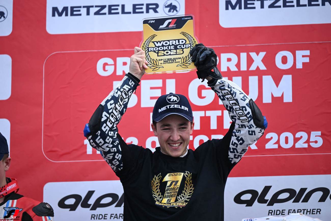 Gabin Pernat, pilote membre de l’Équipe de France Espoir, vainqueur de la Coupe du Monde Supermoto Rookies 2025, à l’issue de la finale disputée en Belgique. Auteur d’un week-end solide et maîtrisé, le Français conclut l’épreuve sur la 3ᵉ marche du podium, juste derrière son compatriote Raphaël Payet (2e), tandis que l’Italien Mattia Rato s’impose en patron.